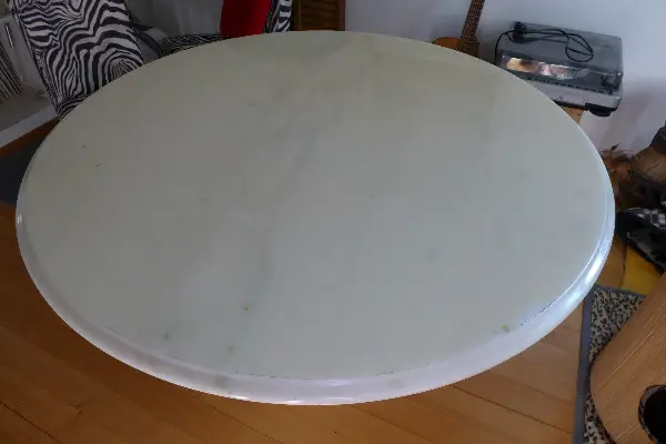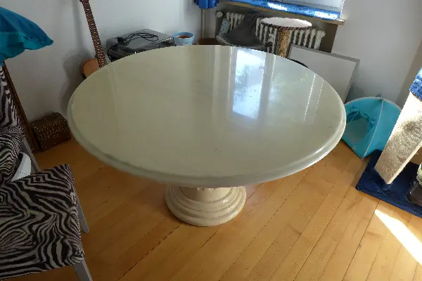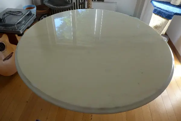 Marmortisch weiss mit Polyester-Schutz.