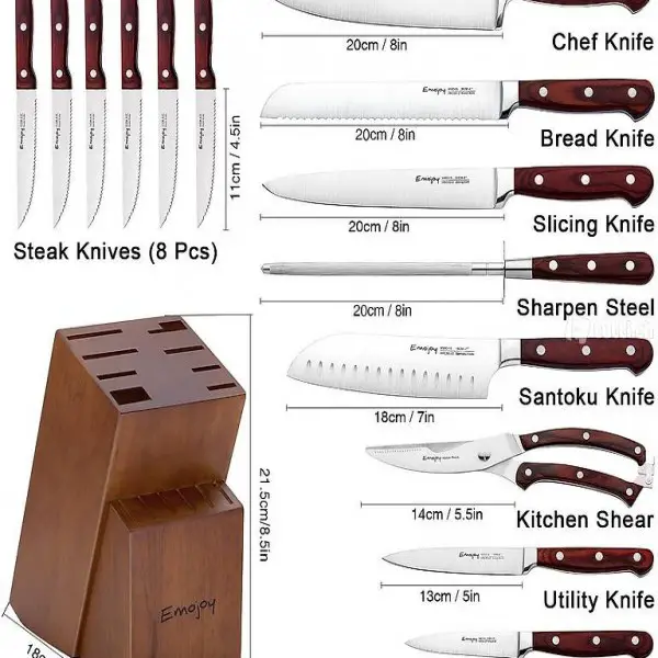 Messerset: Holzblock, 8" Kochmesser, 8" Fleischmesser, 8" Brotmesser, 7" Santoku