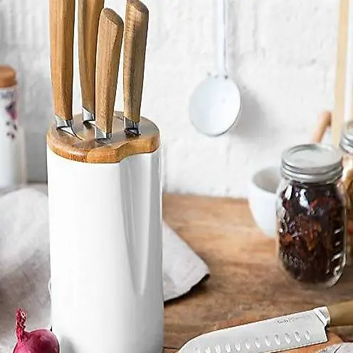MODERNES DESIGN - Der weisse Keramik-Messerbehälter im modernen skandinavischen Design passt zu jeder Küche. Durch die runde Form ist er ausserdem platzsparend. Die Messergriffe aus Echtholz geben Ihrer Küche einen natürlichen Akzent.