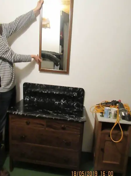 Tanne massiv, 4 Schubladen, Oberplatte und oben Aufsatz in schwarz marmoriert, und ein Spiegel , der quer oder senkrecht aufgehängt werden kann