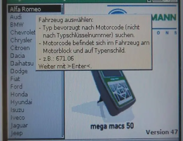 Nachdem Sie Fahrzeug und Steuergerätesystem ausgewählt haben, stehen Ihnen mit mega macs 50 folgende Funktionen zur Verfügung: