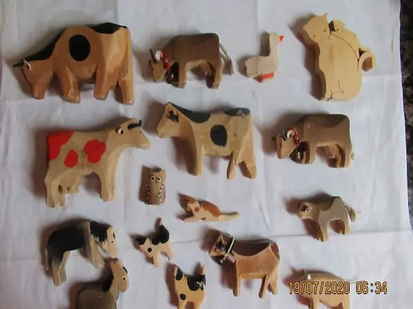 Holztiere, Bauernhoftiere, alt und Holz massiv