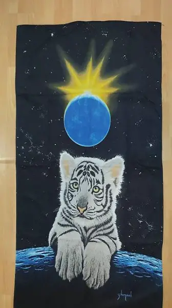 Das Motiv zeigt einen kleinen weissen Tiger auf schwarzem Hintergrund.