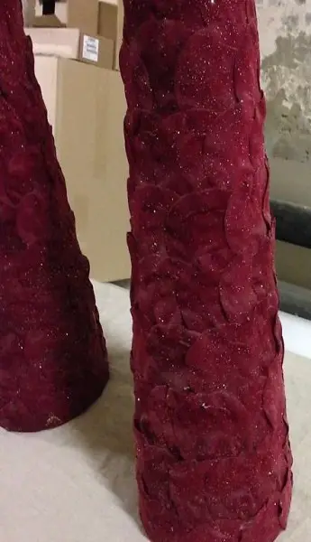 Dekorationskegel aus geklebten Rosenblätter. Durchmesser: 18 cm, Höhe 95 cm. Preis: 30,-- pro Stück oder 50,-- die zwei Stücke. Postsendung möglich, Porto zusätzlich.