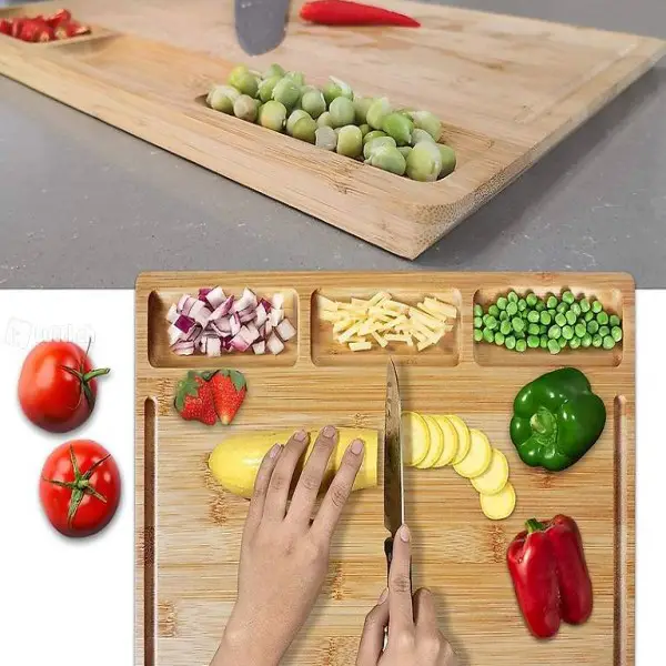 Einzigartiges Design des eingebauten Fachs und der Spüle: Drei eingebaute Fächer auf einer Seite des Schneidebretts, in die Sie vorübergehend gehackten Knoblauch, gewürfeltes Gemüse, Käse usw. legen können. Keine Unordnung mehr auf dem Desktop. Das eingebaute Waschbecken verhindert, dass Saft auf den Tisch fliesst