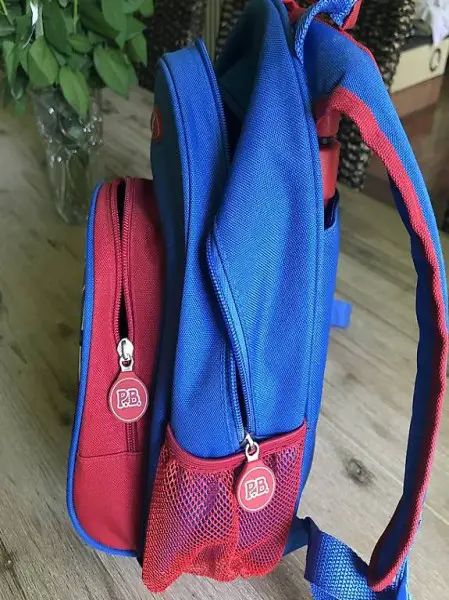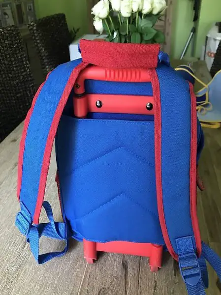 Es hat einen ausziehbaren Griff, Räder und Schultergurte.