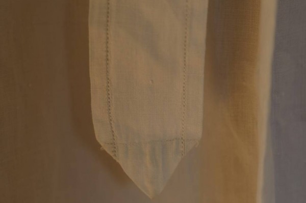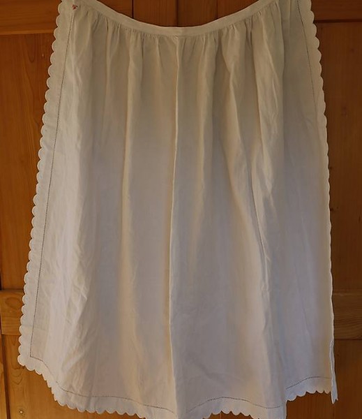 Alte Halbschürze, mit Hohlsaum, Monogramm, Handarbeit, L 90 cm, gosse Grösse, Stoffbreite Bund: 67 cm, Bändel L je 110 cm, B 5,5 cm. Sehr gut erhalten.