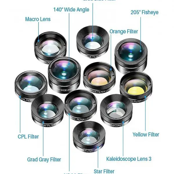 Telefonkameraobjektiv 11in1-Kit: Dieses perfekte Telefonkameraobjektiv-Kit enthält ein Makroobjektiv, ein 140 ° -Weitwinkelobjektiv , einen ND32-Filter, ein Kaleidoskopobjektiv, einen CPL-Filter, einen Sternfilter, ein 205 ° -Fisheye-Objektiv und 2 Grad-Farbfilter (Blau, Grau), 2 Vollfarbfilter (gelb, orange) für Ihre tägliche Fotografie und machen Ihre Fotografie kreativer.