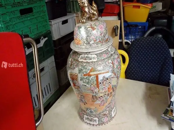 Eine ältere Chinesische Vase Gefäss mit Deckel der Quing Dynasty Copy of Rose canton with Guangxu mark, Vase trägt am Boden ein chinesisches Zeichenstempel, Löwenkopf am Deckel vergoldet und mit diversen Motiven und Bildern, gebraucht aber sonst die ganze Vase und auch der Deckel im sehr gutem und gepflegtem Zustand wurde auch vor vielen Jahren in China gekauft schaut auch meine anderen Artikel muss im Warenlager in Aarau abgeholt werden Vase wird leider nicht versendet entweder Abholung oder Lieferung