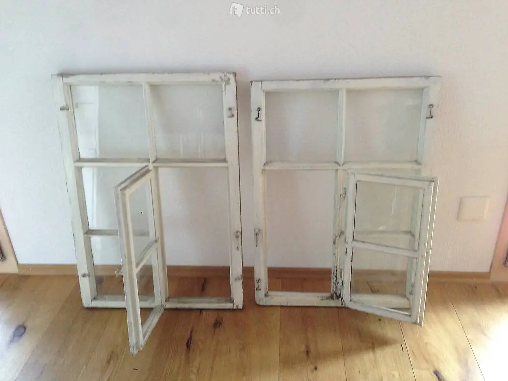 2 alte Fenster (Vorfenster). Weiss lackiert. Mit je einem Flügel mit separater Öffnung. Zum Basteln geeignet.