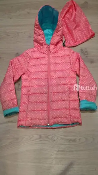 -Übergangsjacke orange mit weissen Tüpfli und Beutel Gr.116 (hat Flecken)