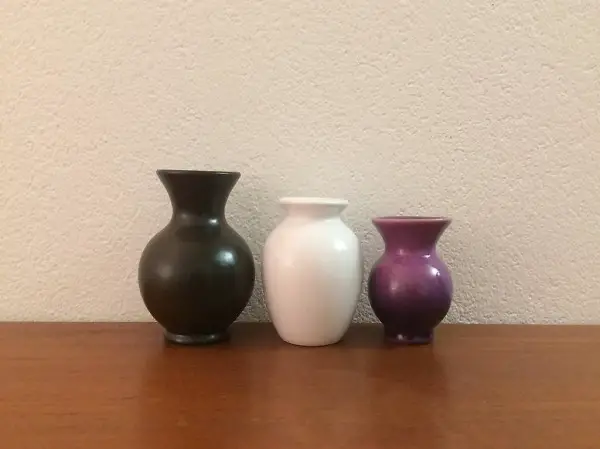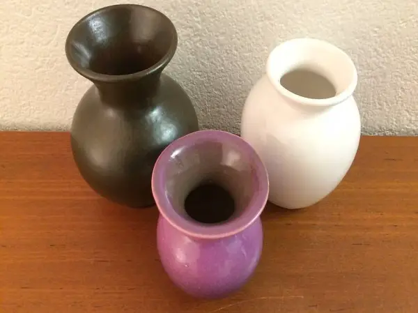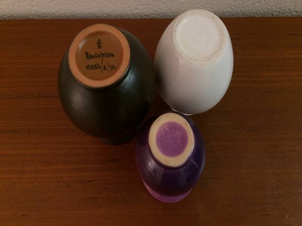 retro Blumenvasen in simplen Formen aus den Sechziger oder Siebziger Jahren. Die drei Vasen bestehen alle aus Keramik. Die grösste ist in dunklem matten braun gehalten, die mittlere in weiss, die kleine ist zweifarbig. Die grosse und die kleine mid century Vasen sind gemarkt: Rheinfelden AZ (Arnold Zahner) 1052/A/31, violett: 1544, die weisse Ziervase ist ungemarkt. Bei den zwei kleineren Vasen handelt es sich vermutlich um Keramika aus Westdeutschland, die grösste stammt aus der Schweiz. Alle drei 1960er 1970er Vasen sind in sehr gutem Zustand und eignen sich gut als