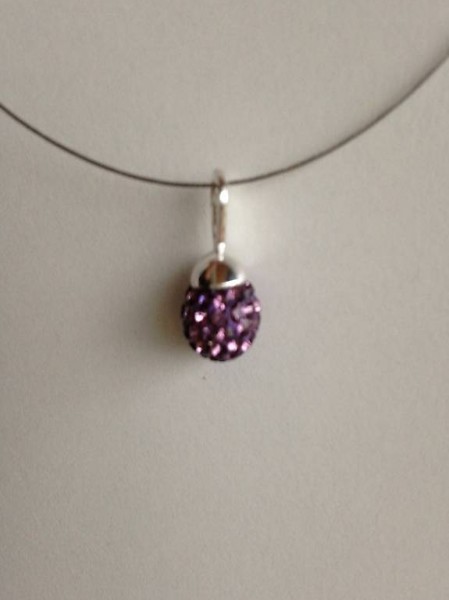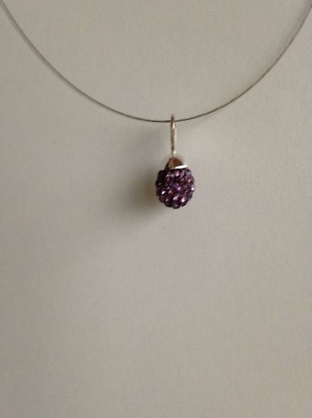En acier semi-rigide pour une grandeur de40cm avec possibilité de chaînette d'extension, et une boule en strass coréen de 8mm amethyst sur une belle bélière en métal argenté.