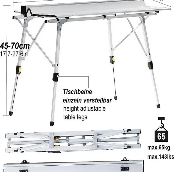 Einfache Auf- und Demontage - Unabhängig höhenverstellbar mit stabilen Beinen zwischen 45 und 69 cm für unebenes Gelände oder als
