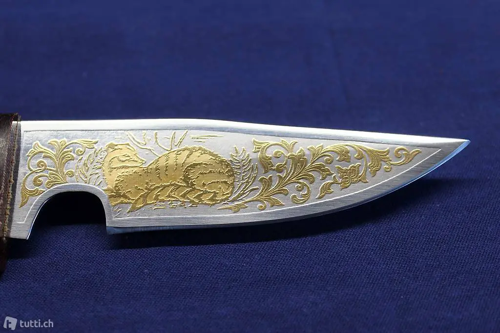 . Klinge ist Ziseliert und mit Gold ausgelegt. Länge : 25 cm, Klinge : 12.5