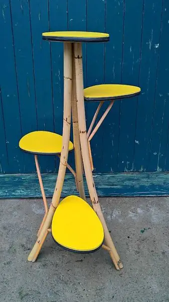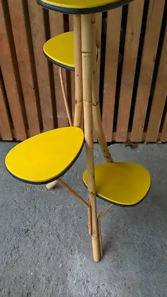 Hingucker der Extraklasse: 50erjahre Pflanzenständer aus Bambus mit vier knallgelben Stellflächen (nicht nur für Pflanzen...)