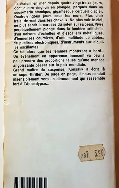 Ils étaient en mer depuis quatre-vingt-treize jours, dont quatre-vingt-un en plongée, parqués dans un sous-marin atomique, gigantesque cercueil d'acier. Quatre-vingt-un jours sous les mers. Plus d'air frais, de vent dans les cheveux. Ne plus voir le ciel, ne plus sentir la caresse du soleil sur sa peau. Vivre perpétuellement plongé dans la lumière artificielle d'un univers d'échelles et d'escaliers métalliques, d'immenses coursives, d'une multitude de câbles, de pupitres électroniques,