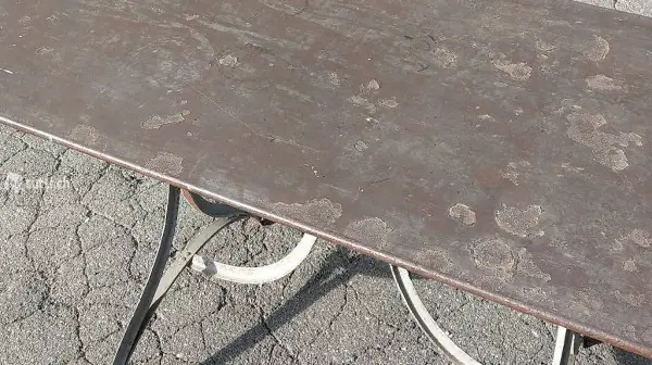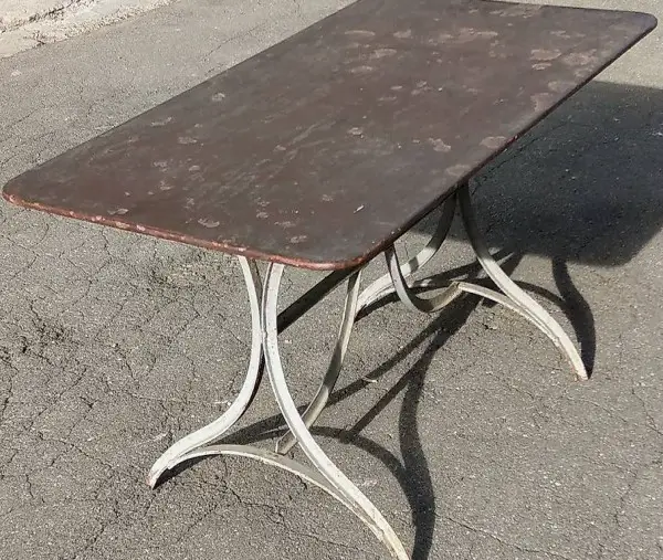 Gartentisch um 1900. Das geschwungene Eisengestell wurde auf Kinderhöhe angepasst. Der