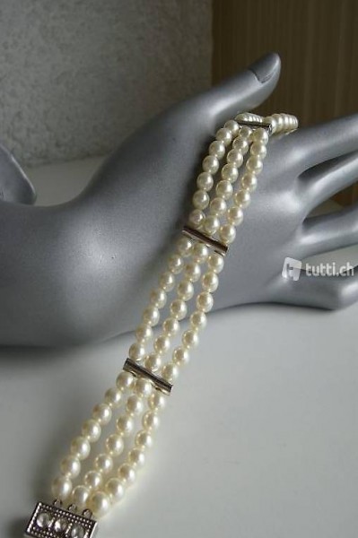 Swarovski Elements Cream de 6mm avec 3 séparateurs platine et un joli fermoir rhodié 3 rangs strass de 18x10mm lui donnant une jolie touche finale. Il fait beaucoup d'effet. Prix au plus bas de 35. -, Rien à redire pour du Swarovski et un objet que vous ne trouverez nulle part ailleurs?
