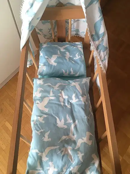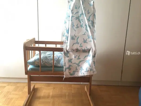 Die Wiege ist aus massivem Holz und superstabil, alle Textilien können gewaschen respektive ausgewechselt werden.