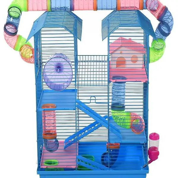 Dazu gehören ein kleines Haus auf der Sitzstange, eine Wasserflasche, Futterschalen, eine Leiter und Übungsräder