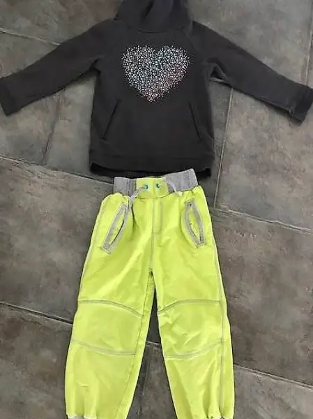 Wir verkaufen 4 Teile im Set, bestehend aus einem sehr schönen, warmen Rolli mit Herzmotiv, ein Pullover grau mit Schmetterlingen, einen Pullover mit Glanzpailletten und eine grüne Sporthose.