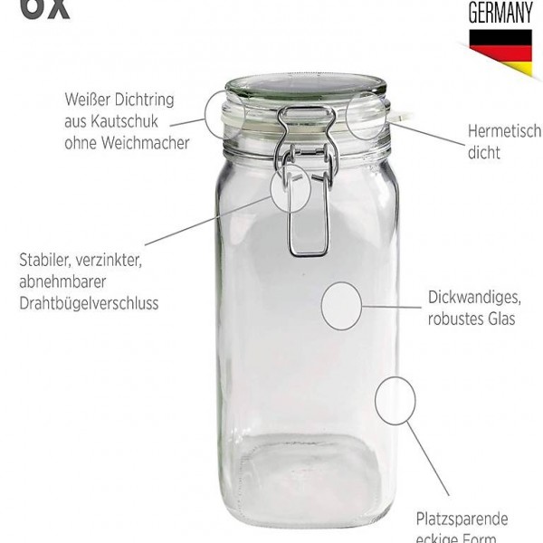 100% lebensmittelecht, 100% luft- und wasserdicht - diese Bügelgläser sind ideal nicht nur als Einweckglas zum Konservieren (Einkochen, Einmachen, Einlegen, Fermentieren) und zur Aufbewahrung von Lebensmitteln wie etwa Mehl, sondern auch als Glasbehälter mit Deckel zum plastikfreien Einkaufen, zum Verschenken von Selbstgemachten, u. v. m.