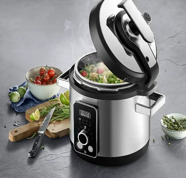 Vielseitige Nutzung dank 8 Programmen über Drehknopf: Schnellkochen, Schongaren, Dampfgaren, Kochen von Reis/ Hülsenfrüchten, Anbraten, Aufwärmen, Rösten und Einkochen - auch individuell einstellbar