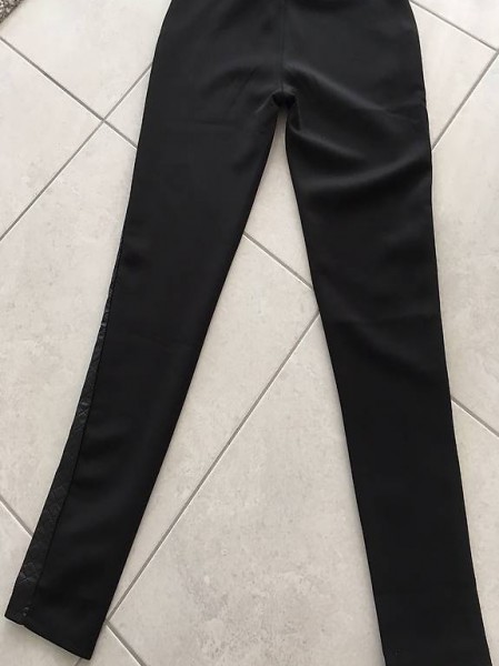 Lässige Stretch-Hose. Seitlicher Einsatz mit Lederoptik. Reissverschluss ist Zier. Gr. S/M, aber sehr dehnbar. Waschbar bei 30 Grad, Polyester und Elastan.