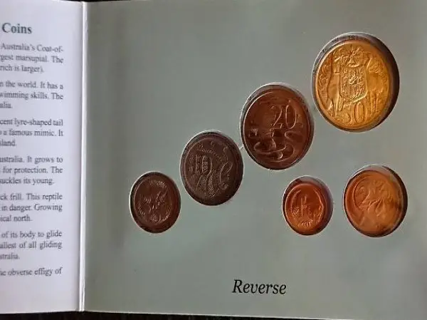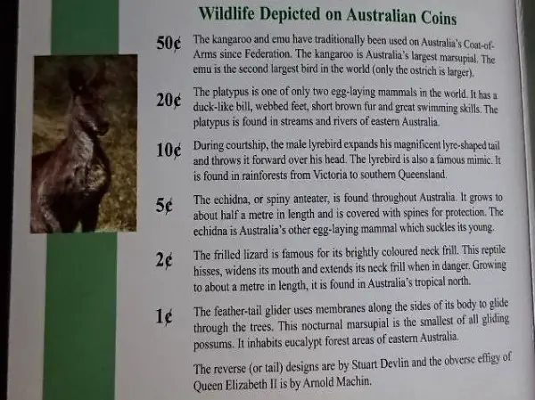 Uncirculated coins. Including 50 Cents Seal of Australia, 2 Cents Platypus, 10 Cents Lyrebird, 5 Cents Spiny Anteater, 2 Cents Frill-Necked Lizard, and One Cent Feather Tailed Glider. Tape residue on top of the cardboard.?