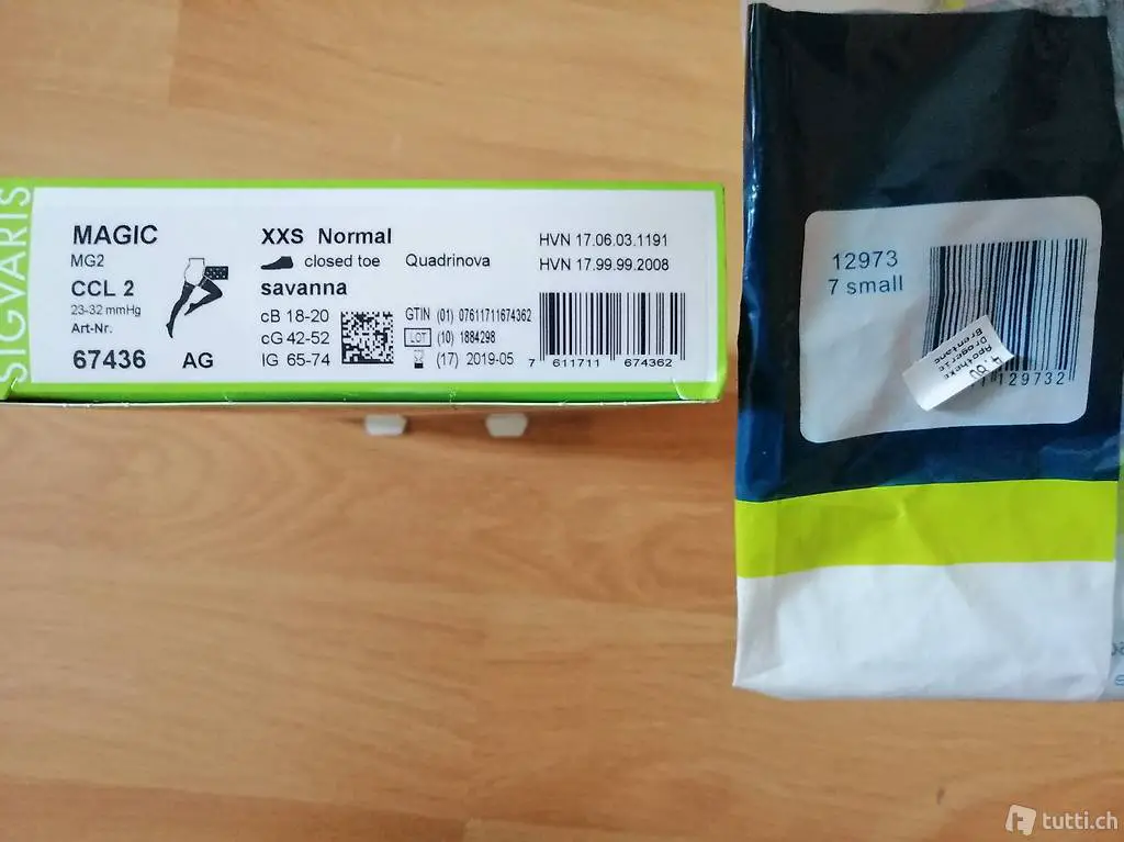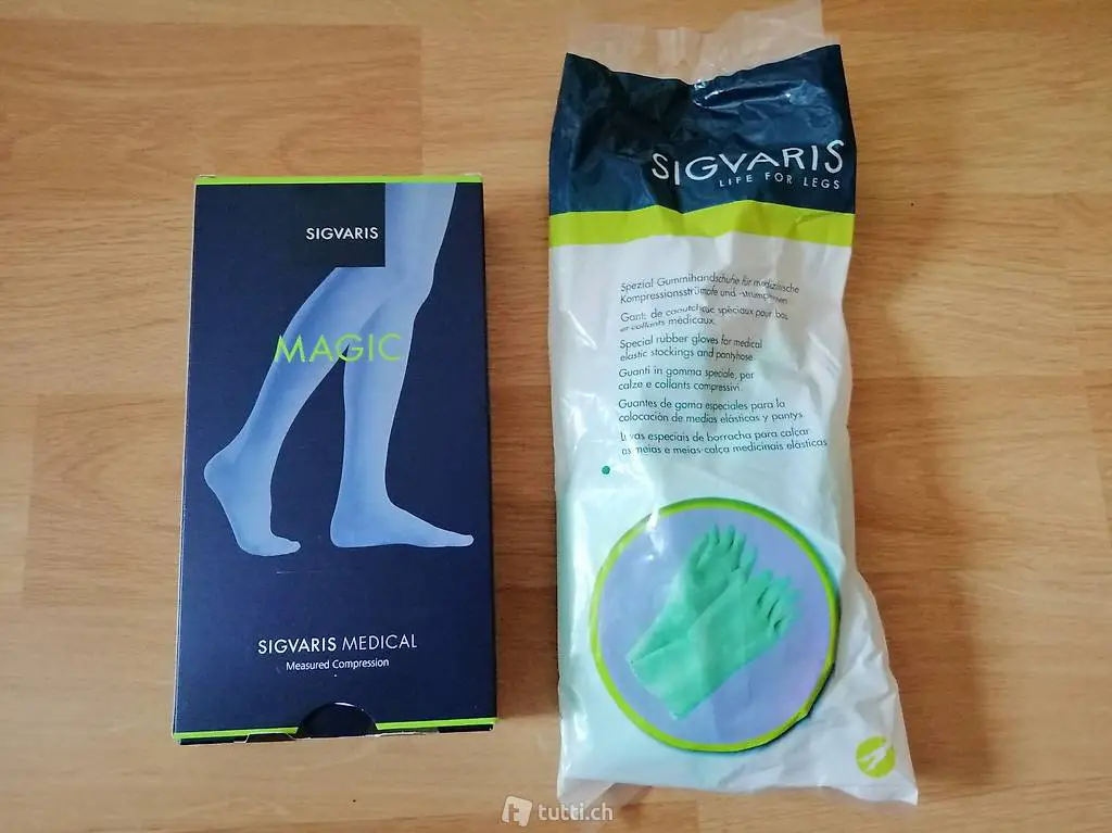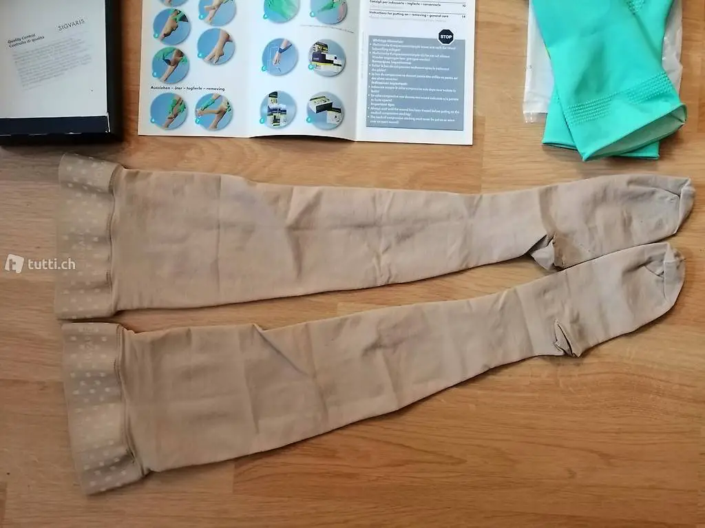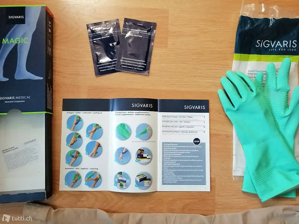 Inkl. passende Gummihandschuhe small mit Noppen und 2 Päckli Handwaschmittel für Kompressionsstrümpfe.