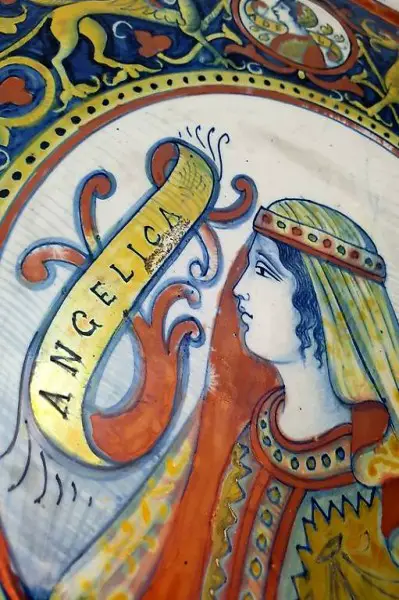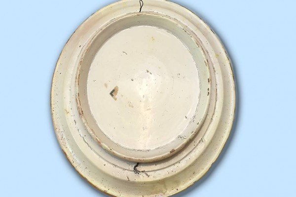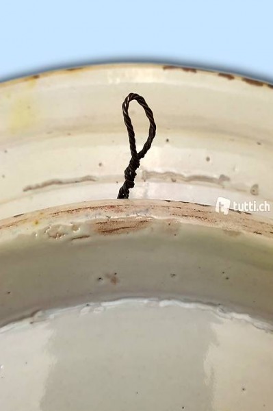 Die Herkunft und das Alter des üppig rot-gold-blau bemalten Keramik-Wandtellers kann nicht bestimmt werden.