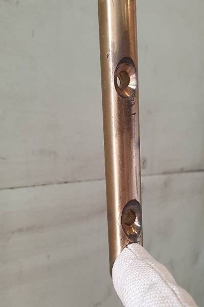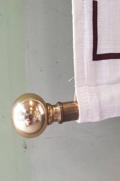 Diese bedruckte Stoff-Werbefahne hing im Gang eines Luxushotels als Wegweiser zur Frühstückslounge. Sowohl Stoff als auch das schwere Aufhängegestänge sind trotz des Alters ohne Gebrauchsspuren. Auf Bild 4 sieht man den oberen Stangenhalter, welcher mit zwei Schrauben an die Wand verankert wird.