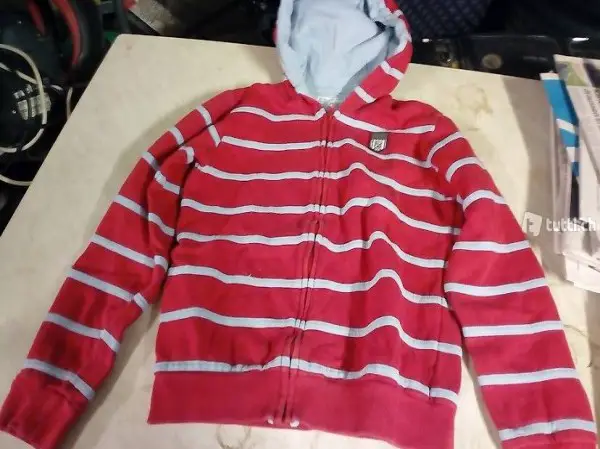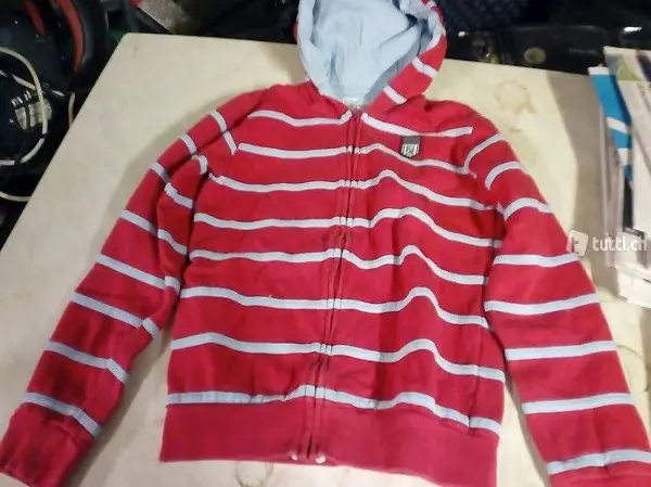 Ein älterer roter gestreifter Pullover Jacke mit Kapuze