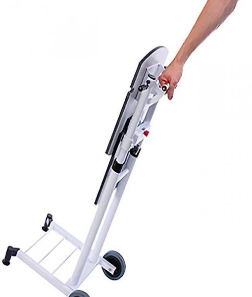 Unterplatte durch Gasdruck-Federsystem. Hohe Mobilität durch grosse Räder (Ø 12,5 cm). Beide Stellflächen einklappbar. Neigbarkeit durch Stellfüsse vorne. Auch als
