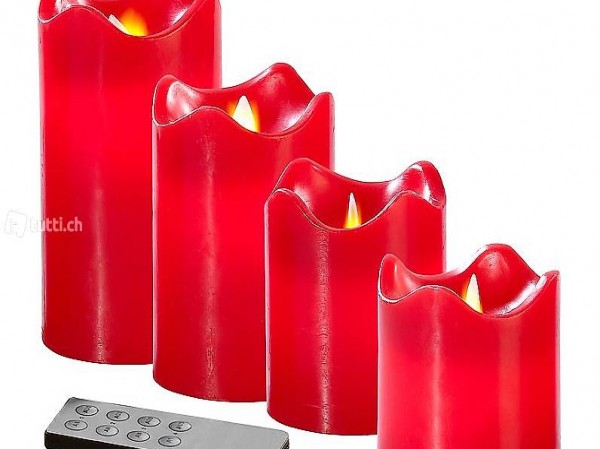 4 Echtwachskerzen mit beweglicher LED-Flamme, abgestuft, rot