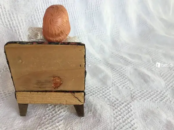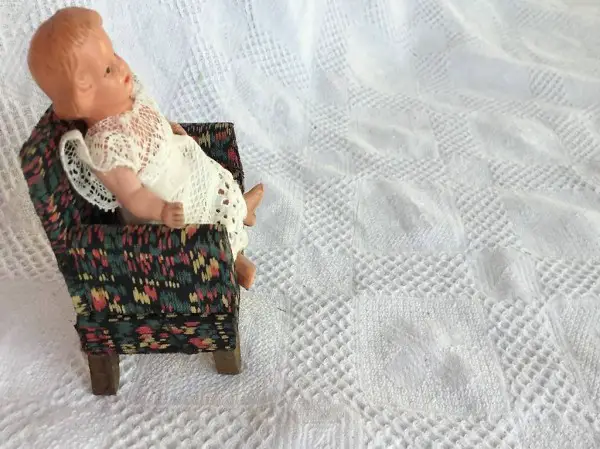 Alter Polstersessel mit Celluloid Puppen Mädchen