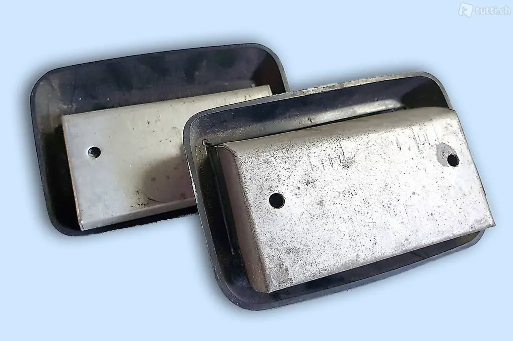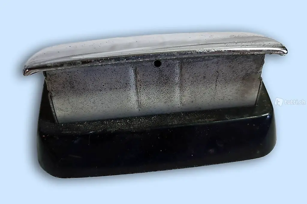 Die beiden Einbau-Autoaschenbecher verkaufen wir inkl. dem schwarzen Rahmen. Wo sie eingebaut waren, ist uns unbekannt. In einem der schwarzen Rahmen ist ein kleiner Riss, welcher problemlos repariert werden kann.