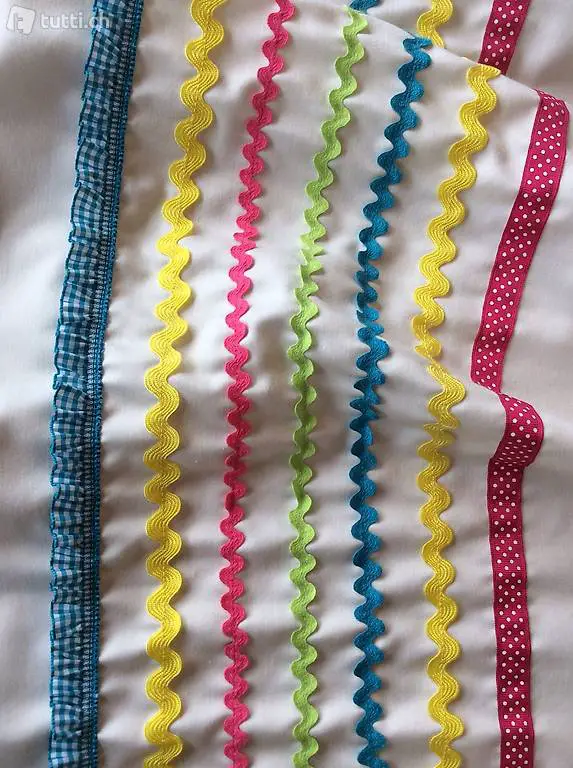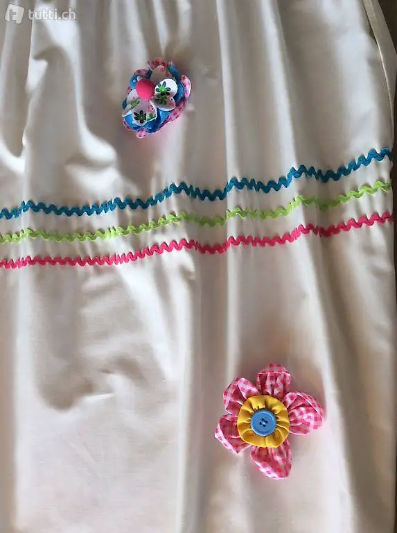 Masse: Länge 214 cm, Saum 10 plus 3 cm (mit Bügelband befestigt), Breite oben (mit Faltenband gezügelt) 90 cm, Breite unten 150 cm