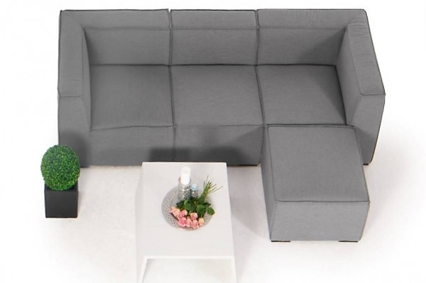 Durch den wohnlichen Touch wirkt die Lounge nicht nur einladend, sondern bietet auch einwandfreien Komfort. Die Outdoor Lounge in der Farbe Grau, besteht aus zwei Eckteilen, einem Mittelteil, einem Fusshocker und einem Tisch.