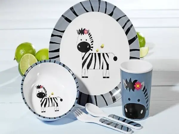 Vaisselle enfants avec des motifs jolis. Ensemble en plastique solide.
