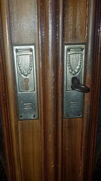 Seitlich an einer inneren Türe (oben und unten) mit Hacken noch zusätzlich verschliessbar.