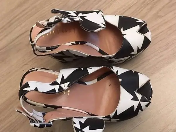 Leder-Sandalen einer Designer-Boutique aus Frankreich, schwarz-weiss gemustert mit Leder-Herz auf der Seite, Peeptoe, Slingback, Plateau, sehr speziell! Grösse 36.5