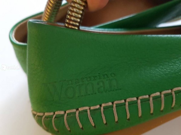 Leder in schönem Froschgrün, mit weisser Rahmennaht und weicher Kautschuk- Sohle. Sportlich-elegant. Seltene satte grüne Farbe, gut kombinierbar zu dunkel oder weiss oder komplementäre Farben.