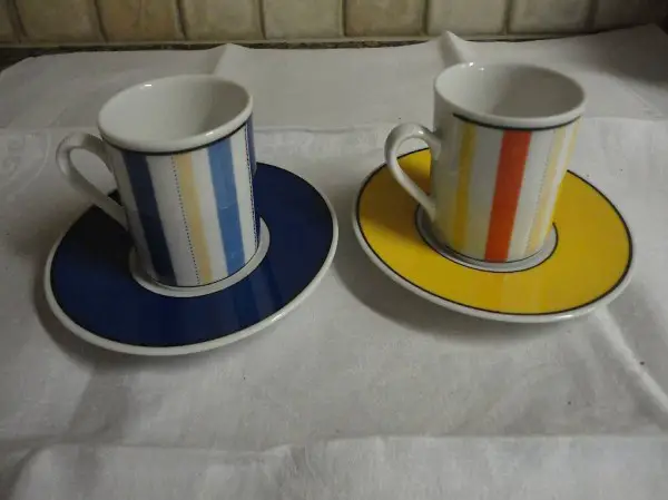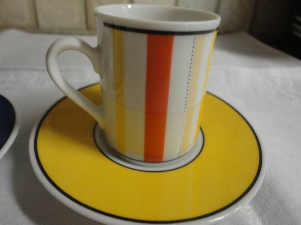 Moccatassen, Mokkatassen, Espressotassen, Kaffeetassen, 2 Stücke mit Untertellerli, mit Unterteller, Grösse 12 cm, in gelb und in blau, Tassen Grösse 5,5/5,5, ungebraucht, DOPPIO PORZELLAN, Winterling MARKTLEUTHEN BAVARIA,