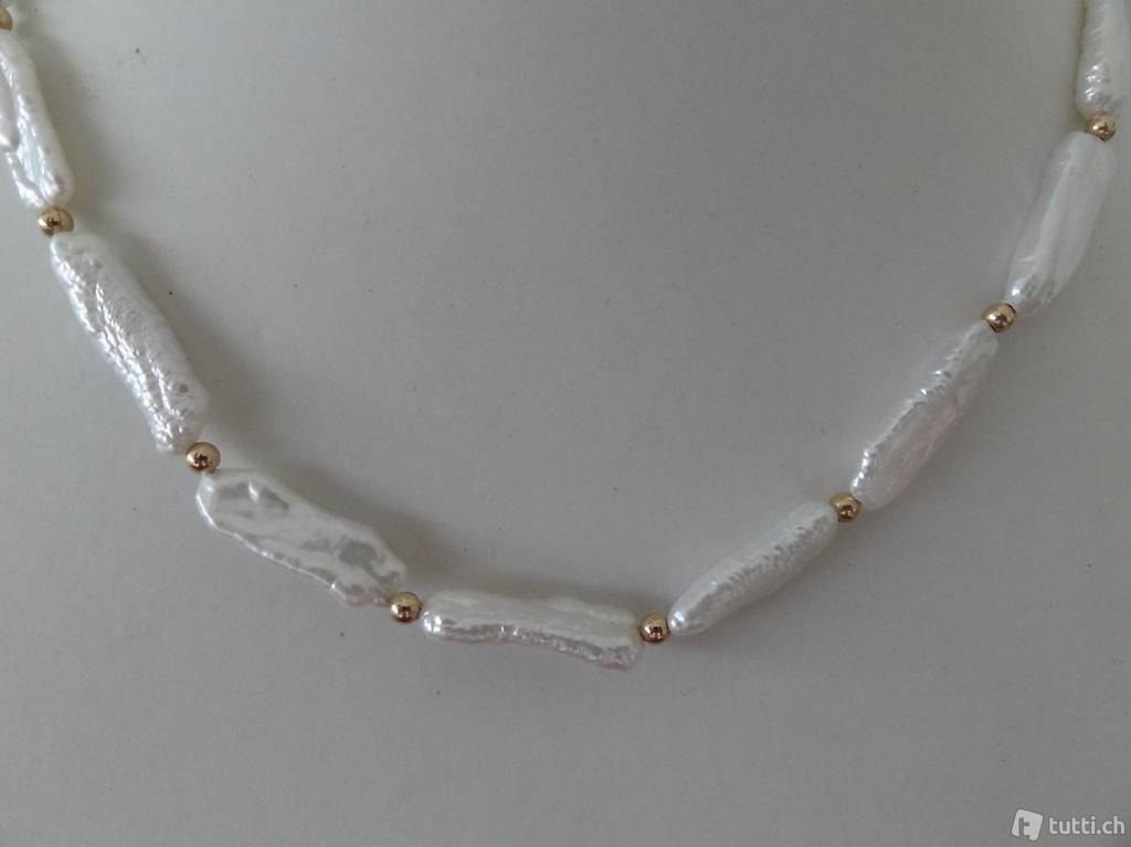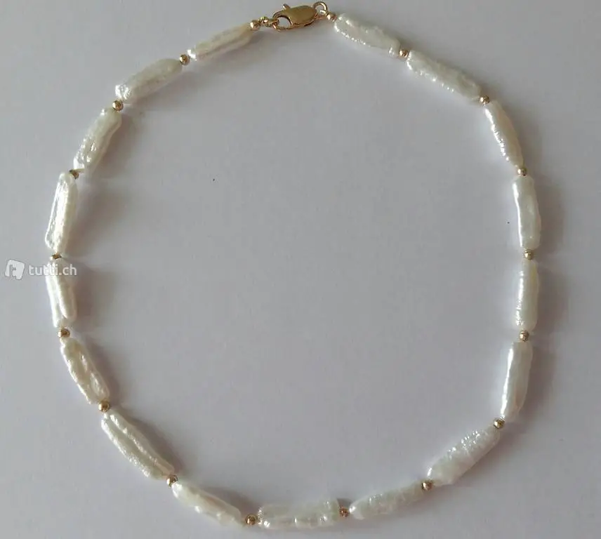 Perlencollier (Süsswasserperlen) mit "goldfilled" kleinen Perlchen und "goldfilled" Verschluss, von Hand auf Faden aufgezogen. Perlen 2.0 - 2.3 cm. Länge