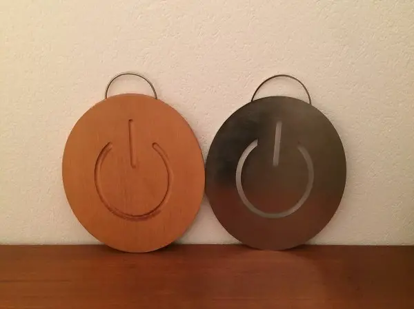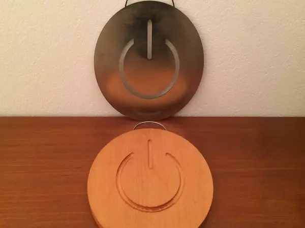 Pfannenuntersetzer. Die identische Form des Schneidbretts / des Untersetzers erinnert etwas an ein ON-Zeichen von
