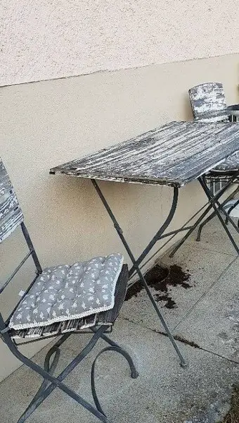 Bei dem Tisch inklusive zwei Klappstühle und Küssi handelt sich von der Marke Van Deurs.