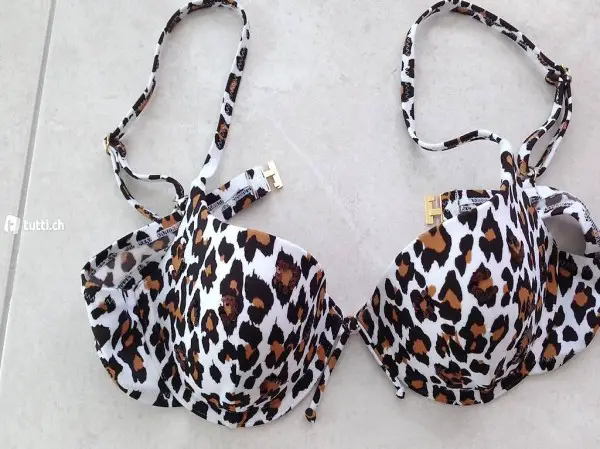 , Gr. 38,75 B weiss mit Leoparden-Muster. Brustschale gepolstert und ganz gefüttert, Hosen können an der Seite mehr oder weniger eng gemacht werden.
