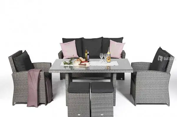 Entdecken Sie die perfekte Mischung aus Stil und Gemütlichkeit mit unserer Rattan-Sitzgruppe inklusive Esstisch. Mit ihrem charmanten Design lädt sie zum Verweilen ein, sei es für ein entspanntes Gespräch oder ein köstliches Mahl im Freien. Das hochwertige Rattan sorgt nicht nur für eine ansprechende Optik, sondern auch für Robustheit und Langlebigkeit. Machen Sie Ihren Aussenbereich zu einem Ort des Genusses und der Entspannung mit unserer einladenden Rattan-Sitzgruppe.